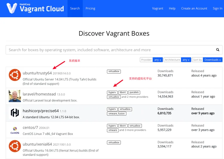 我们可以从Vagrant Cloud网站上找到支持不同虚拟化平台的Box文件。